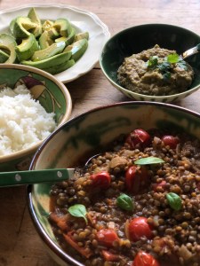 Le dahl est un plat indien normalement préparé avec du lait de coco. J’ai choisi cette fois ci de le laisser nature et de prendre des lentilles vertes. Vous pouvez l’accompagner de riz, d’avocat en tranches et d’un guacamole d’aubergine...