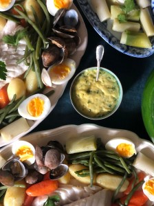 Disposez dans un plat le poisson au centre, les légumes autour, les œufs. Dans un bol mettez la sauce. Parsemez le poisson et les légumes de persil ou d’herbes fraiches.