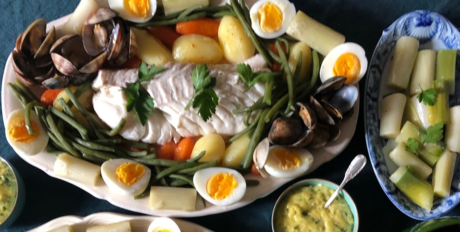 Disposez dans un plat le poisson au centre, les légumes autour, les œufs. Dans un bol mettez la sauce. Parsemez le poisson et les légumes de persil ou d’herbes fraiches.