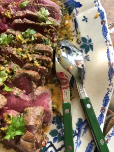 Couper en tranches très fines. Posez dessus des feuilles de coriandre un un peu de marinade. Se sert avec la salade de fèves par exemple.