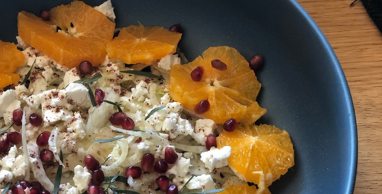 - Coupez la grenade en deux et prélevez-en la moitié que vous disperserez sur le fenouil et la féta.