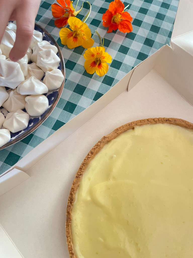 Verser sur le fonds de tarte. Mettre au froid.Décorer … meringues, fleurs